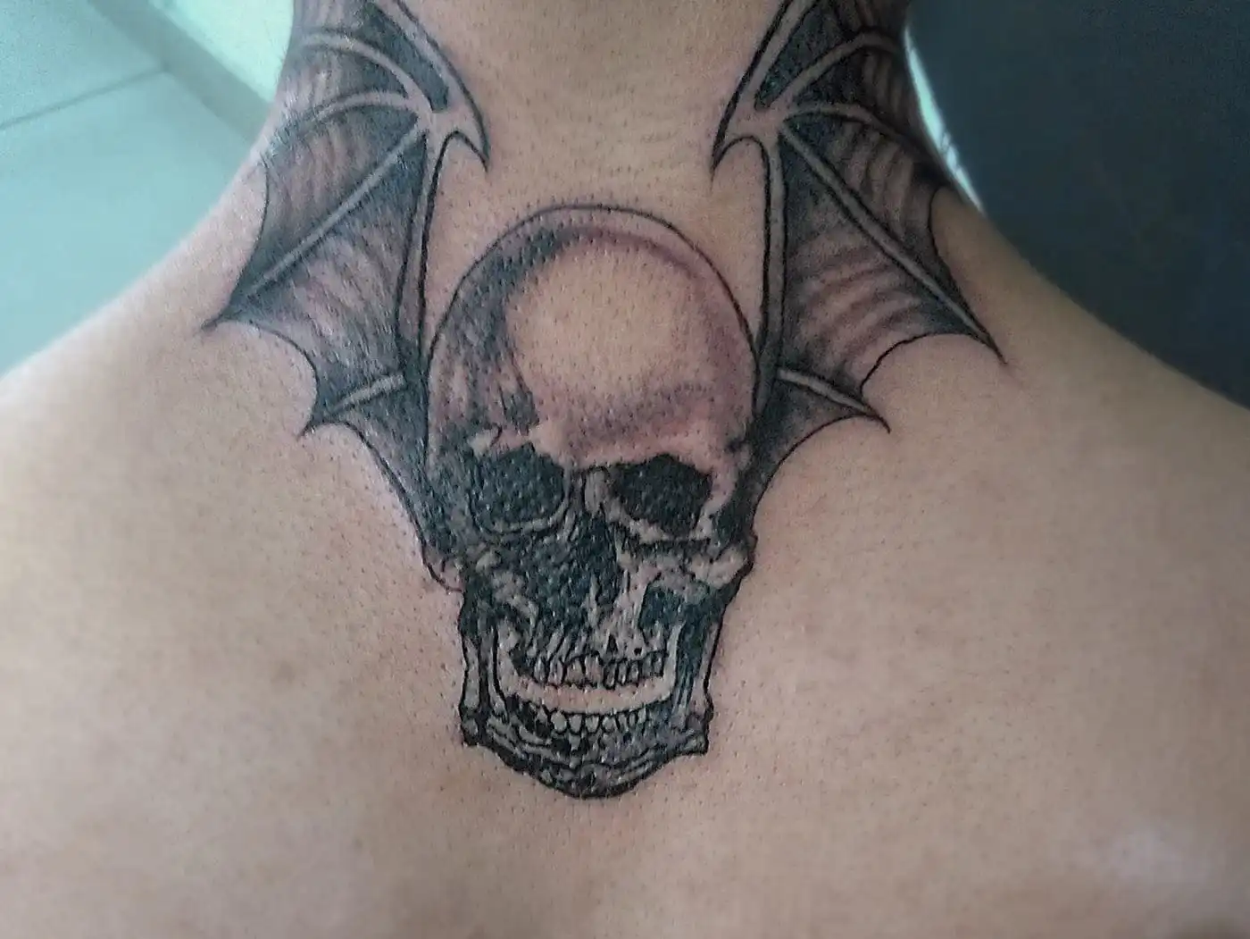Tatuaje del logo de Avenged Sevenfold, la banda que define el metal moderno. Una mezcla de metalcore, heavy metal y hard rock, con riffs potentes y melodías épicas. ¡Un símbolo de pasión por el buen metal! 🤘