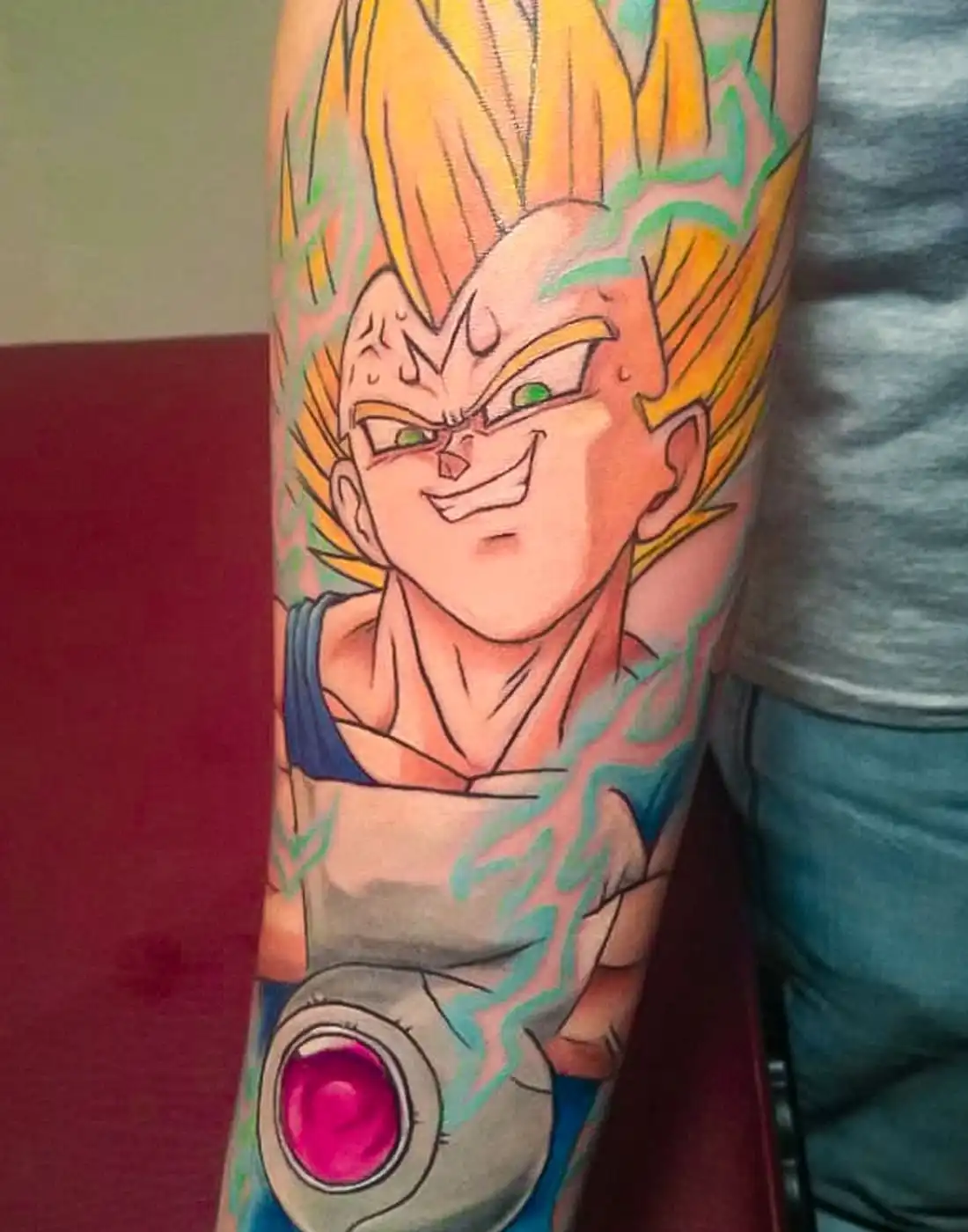 Tatuaje de Magin Vegetta, el guerrero definitivo de mi infancia. Representa la fusión más poderosa de 'Dragon Ball Z' y ese espíritu de superación que nos enseñó la serie. ¡La esencia de la cultura otaku y el anime grabada en la piel! ✨