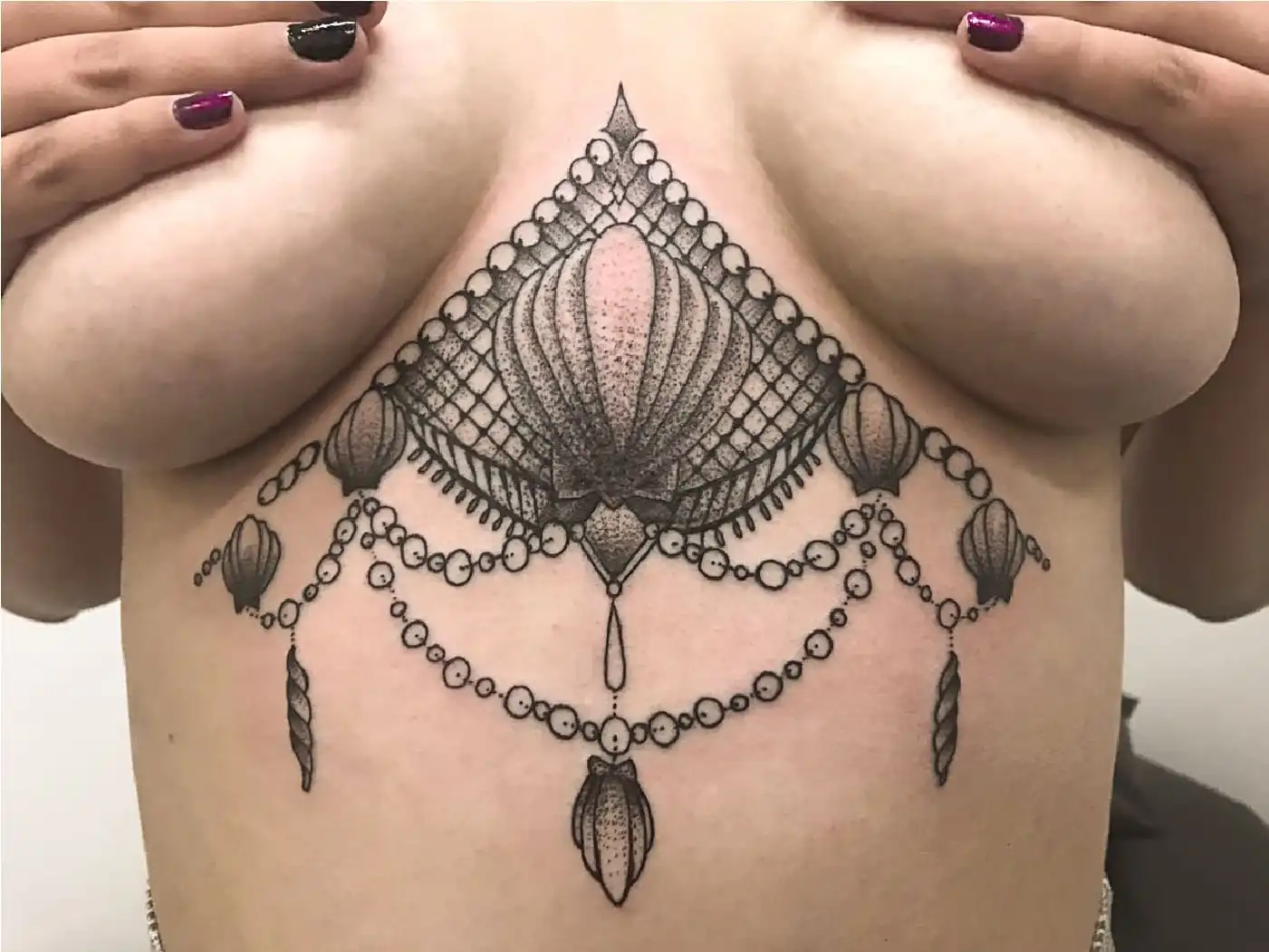 Tatuaje en la zona under bra (bajo el busto) que fusiona la delicadeza del encaje con la belleza orgánica de las conchas marinas, todo en un estilo blackwork de líneas definidas y sombras profundas. Una pieza que juega con los contrastes: lo frágil y lo fuerte, lo ornamental y lo natural, creando un diseño sensual, elegante y lleno de misterio.